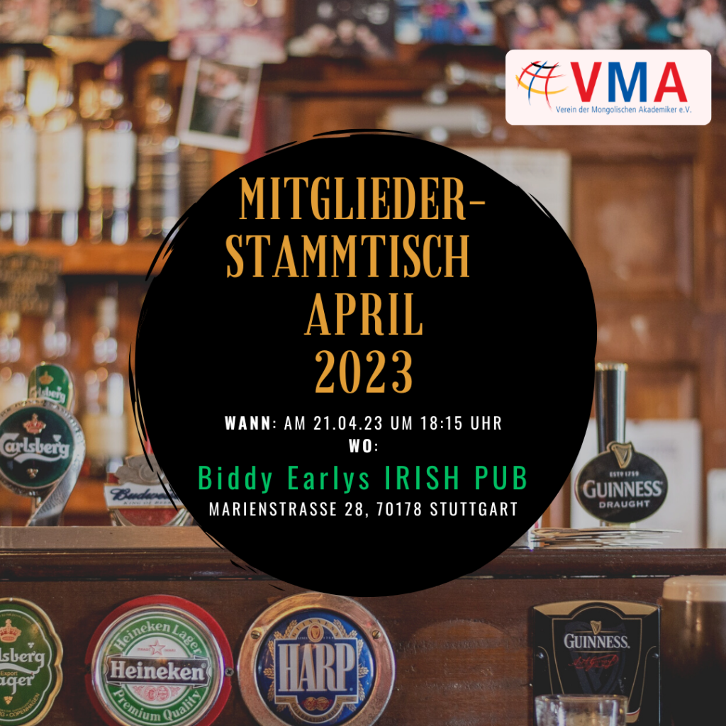 Уулзах огноо, газар: 4 сарын 21-ий 18:15 цагт, Biddy Earlys IRISH PUB, Marienstraße 28, 70178 Stuttgart